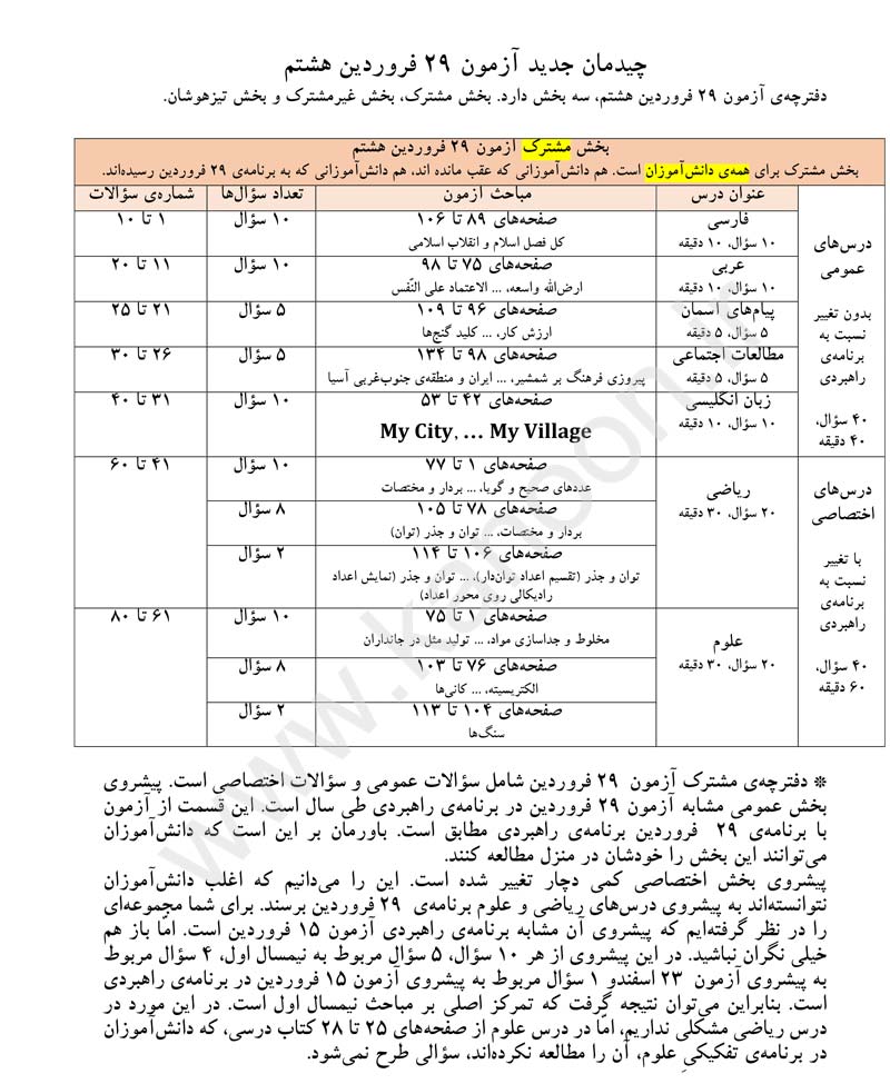 چیدمان جدید آزمون ۲۹ فروردین هشتمدفترچهی آزمون ۲۹ فروردین هشتم، سه بخش دارد. بخش مشترک، بخش غیرمشترک و بخش تیزهوشان.برنامهی این آزمون را از فایل ضمیمه دانلود کنید.