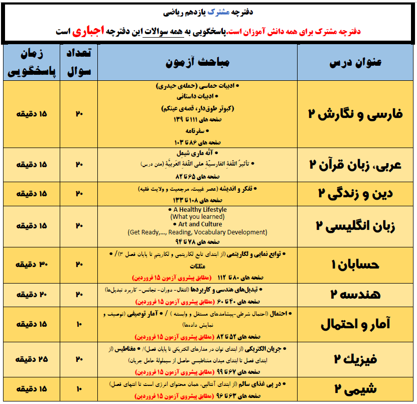 دفترچه ی مشترک شامل درس های عمومی با برنامه آزمون 29 فروردین است . همه ی دانش آموزان می توانند به سوال های درس های عمومی طبق برنامه پاسخ دهند.