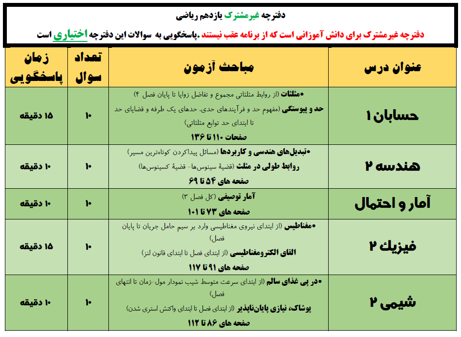 در دفترچه ی مشترک ،در دروس اختصاصی برنامه ی آزمون 15 فروردین را به طور مشترک امتحان خواهید داد . این ها مباحثی است که در آزمون 15 فروردین پاسخ داده اید.