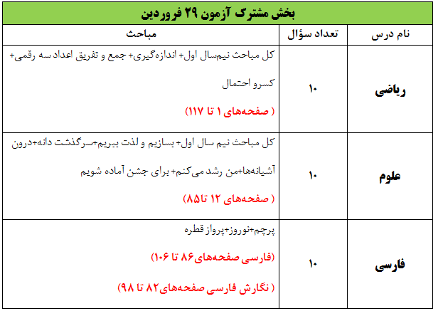 در این بخش سؤالهای ریاضی و علوم منطبق بر مباحث آزمون 15 فروردین است و درس فارسی منطبق بر آزمون 29 فروردین یعنی: