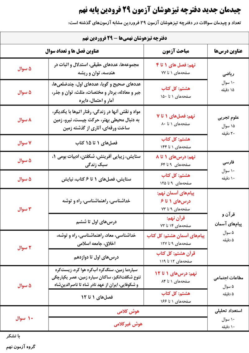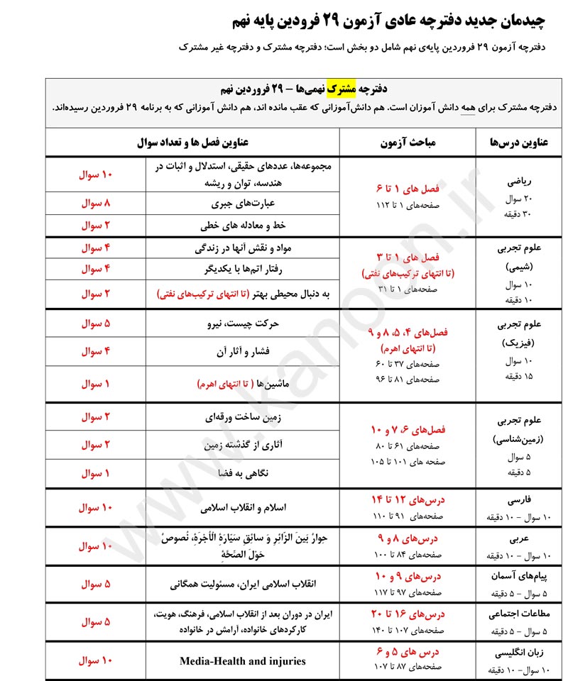 برنامه آزمون 29 فروردین پایه نهم ( بخش مشترک و بخش غیرمشترک)