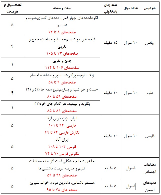 برای درسهای فارسی، مطالعات اجتماعی و هدیههای آسمان هم می توانید به راحتی پیشخوانی کنید و خودتان را به مباحث این آزمون برسانید. دقت کنید که نصف مباحث این درسها در آزمون 15 فروردین مرور شده اند.
