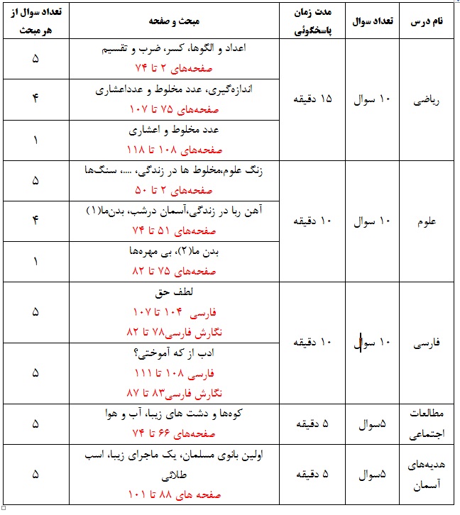 برای درسهای فارسی، مطالعات اجتماعی و هدیههای آسمان هم می توانید به راحتی پیشخوانی کنید و خودتان را به مباحث این آزمون برسانید. دقت کنید که نصف مباحث این درسها در آزمون 15 فروردین مرور شده اند.