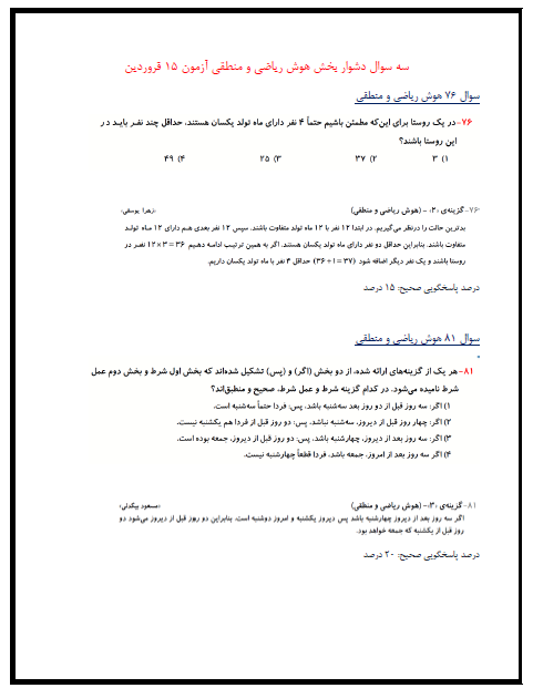 در ادامه برای شما 3 سوال دشوار از سوالات هوش ریاضی و منطقی آزمون 15 فروردین آورده شده است. فایل این سوالات را در ادامه مطلب میتوانید دریافت کنید.