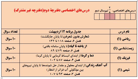 و اما دانش اموزانی که توانسته اند مطابق با برنامه 12 اردیبهشت(طبق برنامه راهبردی) پیش خوانی کنند یا درس کلاس آنلاین شان به برنامه 12 اردیبهشت رسیده است علاوه بر دفترچه مشترک به دفترچه غیر مشترک نیز پاسخ خواهند داد که شامل 2/8 نیم سال دوم است.