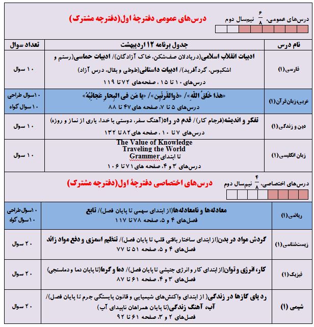 برنامة آزمون 12 اردیبهشت دهم تجربی