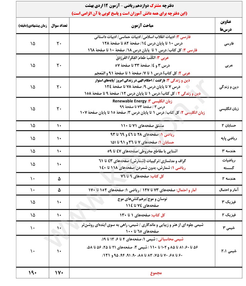 1- دفترچه مشترک شامل 80 سوال عمومی و 90 سوال اختصاصی(پایه و دوازدهم) است. زمان پاسخ گویی به این 170 سوال 190 دقیقه است. لازم به ذکر است همه دانش آموزان باید به این دفترچه پاسخ دهند.