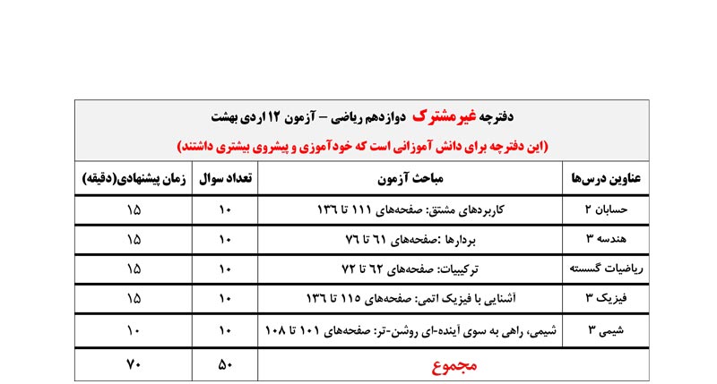 2- دفترچه غیر مشترک شامل 50 سوال اختصاصی دوازدهم است. زمان پاسخگویی به این دفترچه 70 دقیقه می باشد.