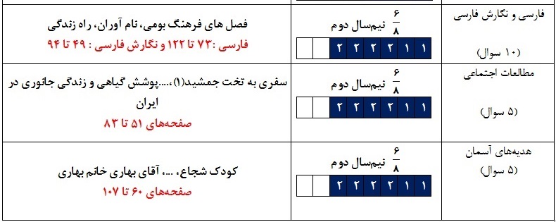 بخش تستی : 10 سوال ریاضی ، 10 سوال علوم، 10 سوال فارسی ، 5 سوال مطالعات اجتماعی، 5سوال هدیه های آسمان
