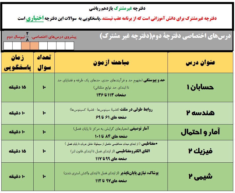 دفترچه غیر مشترک: شامل پنج درس اختصاصی حسابان، هندسه ، آمار و احتمال، فیزیک و شیمی است که هر کدام از ایندرس ها شامل 10 سوال می باشند ، پس دفترچه غیر مشترک شامل 50 سوال است که در مدت زمان 60 دقیقه به آن پاسخمیدهید .
