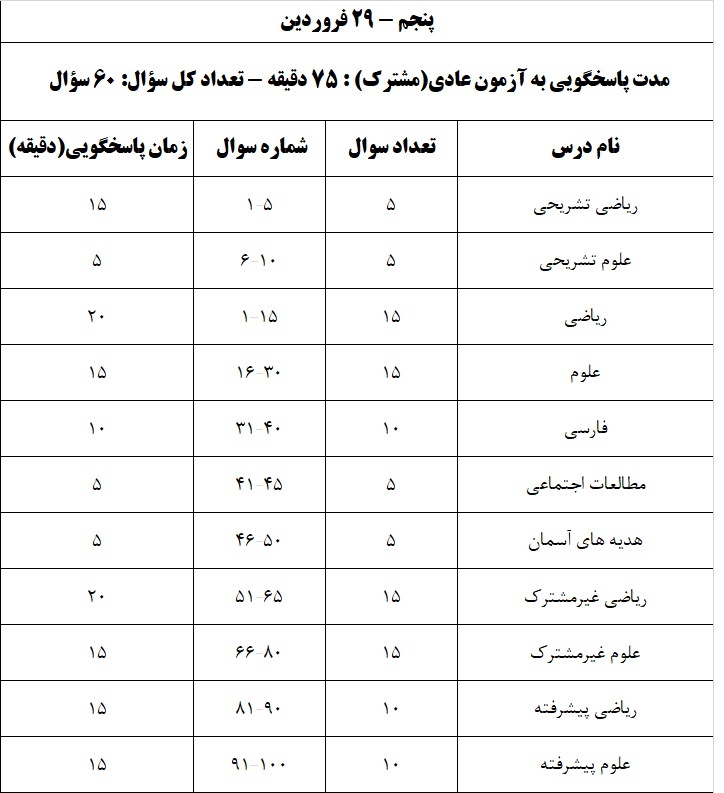 ویژگیهای آزمون 29 فروردین پنجم دبستان