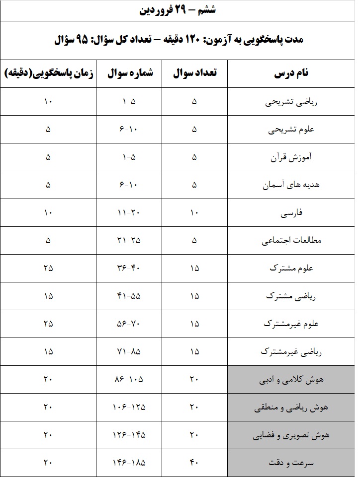 ویژگیهای آزمون 29 فروردین ششم دبستان