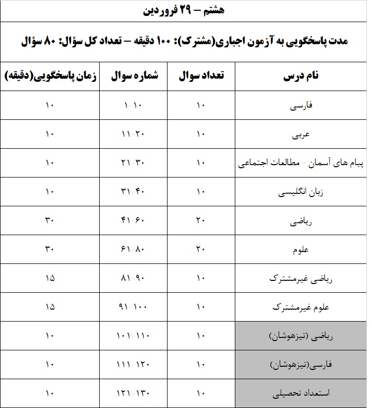 ویژگیهای آزمون 29 فروردین پایه هشتم
