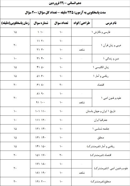 ویژگیهای آزمون 29 فروردین پایه دهم انسانی