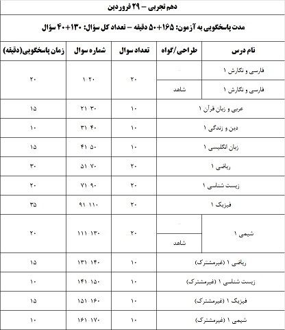 ویژگیهای آزمون 29 فروردین پایه دهم تجربی