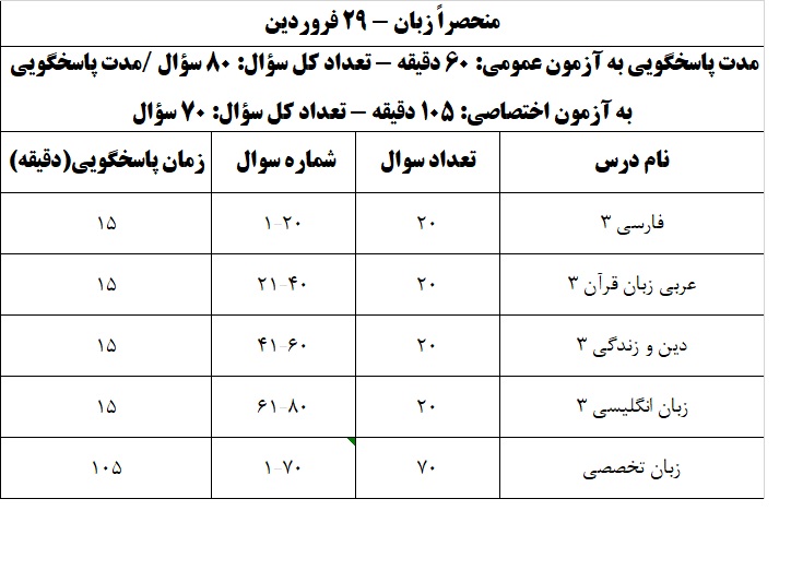 ویژگیهای آزمون 29 فروردین گروه منحصراً زبان