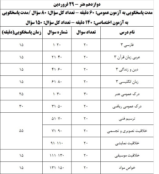 ویژگیهای آزمون 29 فروردین گروه هنر