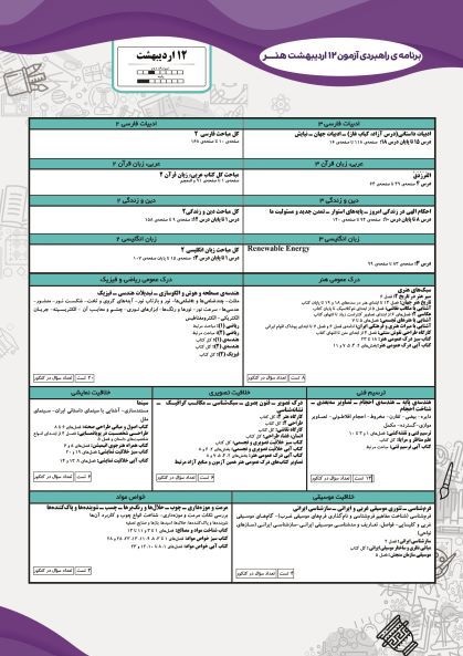 آزمون 12 اردیبهشت دومین آزمون از پروژه هفتم است و درسهای مربوط به پایه مثل تاریخ هنر جهان، اصول و مبانی طراحی صحنه و ... به اتمام میرسد. به عبارتی در این آزمون تعداد زیادی از مباحث را تکمیل خواهید کرد.(پیشروی در تمام درس ها) پیشنهاد میکنیم اگر در این مباحث قسمتی را کامل نخواندهاید یا خیلی ناقص خواندهاید آن را در دوران قبل از دوران جمع بندی که ما آن را دورهی انتقالی مینامیم، تکمیل کنید. در قسمت مربوط به درس های تخصصی هنر در نیم سال دوم مثل سیرهنر در تاریخ 2، کارگاه هنر و ... هم پیشروی خواهیم داشت. بعضی از درس ها و مباحث در این آزمون تکراری هستند مثل درک عمومی ریاضی و فیزیک و ترسیم فنی، تعدادی مباحث خواص مواد چوب، چسب، حلال ها و رنگ برها و در درس خلاقیت موسیقی به غیر از موسیقی نواحی ایرانی، پس فرصتی است برای جبران این مباحث.