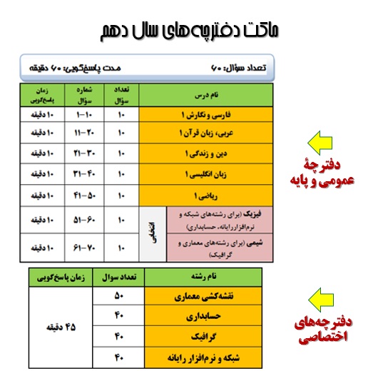ماکت دفترچههای 12 اردیبهشت دهم هنرستان:دهمیهای هنرستان، در آزمون 12 اردیبهشت دو دفترچه خواهید داشت، در تصویر زیر، تعداد سوالات هر دفترچه و زمان پاسخگویی به آن را مشاهده میکنید.