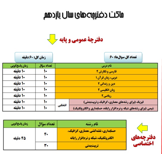 ماکت دفترچههای 12 اردیبهشت یازدهم هنرستان:یازدهمیهای هنرستان، در آزمون 12 اردیبهشت دو دفترچه خواهید داشت، در تصویر زیر، تعداد سوالات هر دفترچه و زمان پاسخگویی به آن را مشاهده میکنید.