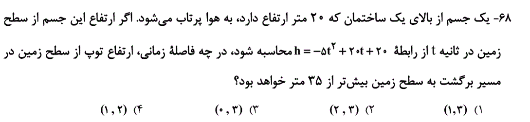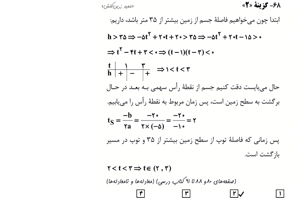 دانش آموزانی که گزینه "1" را انتخاب کرده اند، به عبارت "در مسیر برگشت" در صورت سوال دقت نکرده اند. در بازه (1,3)، ارتفاع توپ از سطح زمین بیشتر از 35 متر است ولی با توجه به اینکه نقطه راس سهمی به ازای t=2 حاصل می شود، بازه (1,2) در مسیر رفت و بازه (2,3) در مسیر برگشت قرار دارد و در نتیجه جواب مسئله تنها شامل بازه (2,3) است.