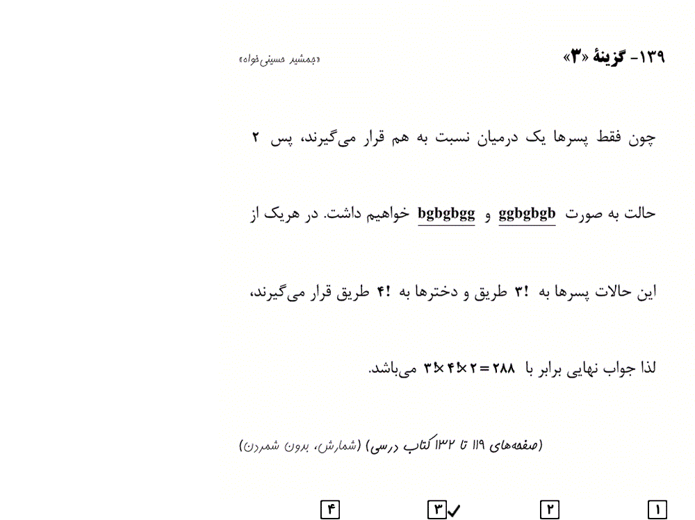 توجه کنید در صورت مسئله خواسته شده است که تنها پسرها به صورت یکی در میان قرار بگیرند، اما دانش آموزانی که گزینه "2" را انتخاب کرده اند، حالت هایی را محاسبه کرده اند که دخترها و پسرها به صورت یکی در میان در یک ردیف قرار بگیرند. در این حالت داریم: