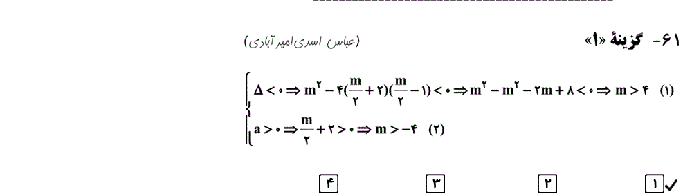 دانش آموزانی که گزینه "2" را انتخاب کرده اند، بالای محور xها بودن سهمی را با رو به بالا بودن سهمی اشتباه گرفته اند. شرط آنکه سهمی رو به بالا باشد، آن است که ضریب عبارت درجه دوم مثبت باشد که در این صورت داریم: