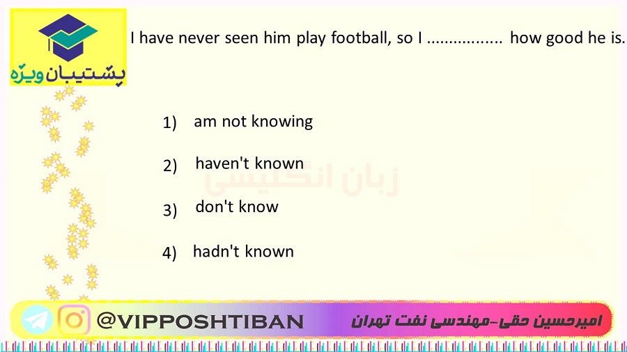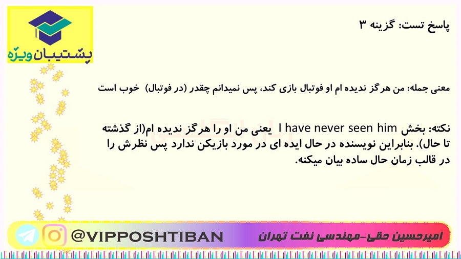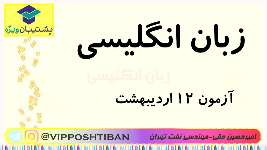 این مجموعه برای مرور مباحث درس زبان انگلیسی در آزمون ۱۲ اردیبهشت هست. بعد از خواندن درس و تمرین کافی برای مرور مطالب این تست ها را حل کنید. (برای مشاهده بخش اول واردلینک زیر شوید)