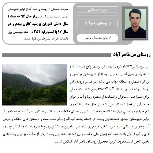 مهرداد سلطانی از روستای ناصرآباد از توابع شهرستان نوشهر استان مازندران هستم.از سال 96 به مدت 1
