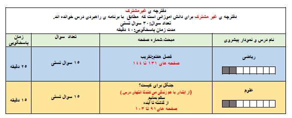 بخش غیرمشترک شامل 30 سوال از 20 درصد پایانی مباحث نیمسال دوم در درس های ریاضی و علوم است.