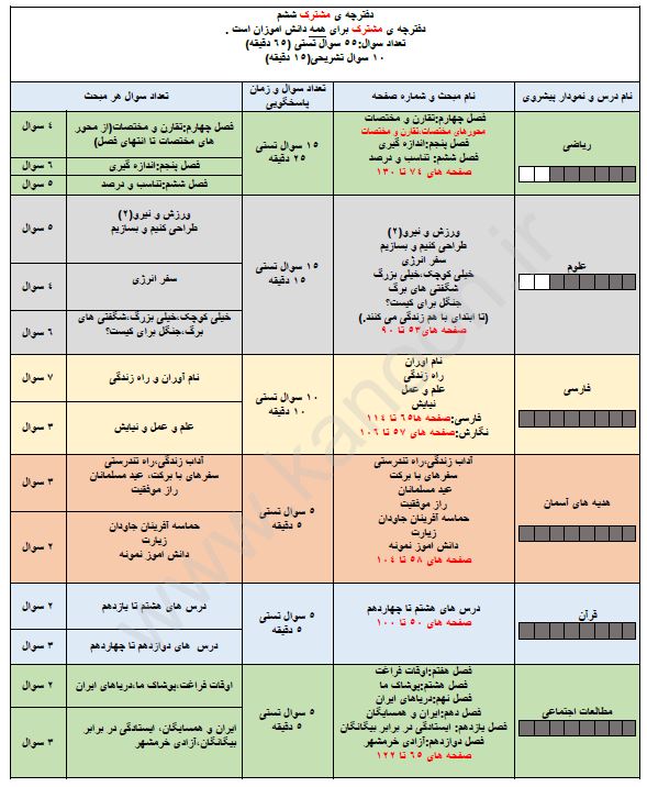بخش مشترک این آزمون شامل تمام درسهای دفترچه پیشرفت درسی است.در این آزمون درس های فارسی،مطالعات اجتماعی،هدیه های آسمان و قرآن تمام مباحث نیم سال دوم و درس های ریاضی و علوم 80 درصد مباحث نیم سال دوم را شامل میشوند.