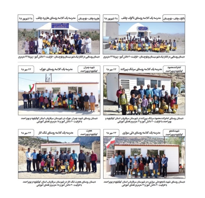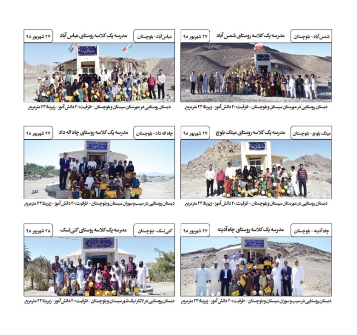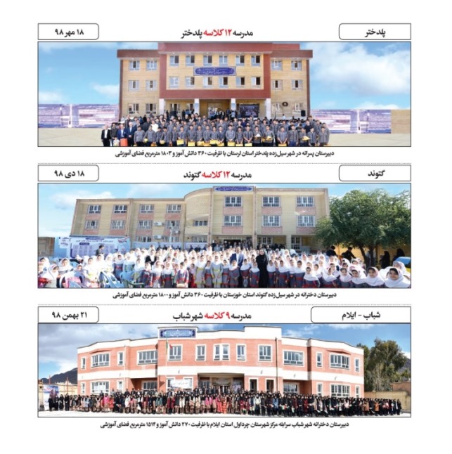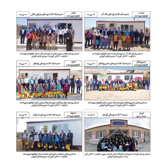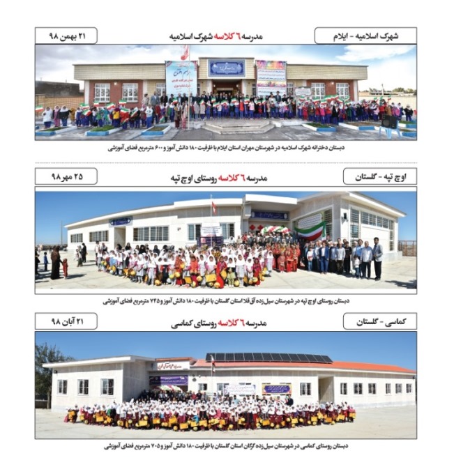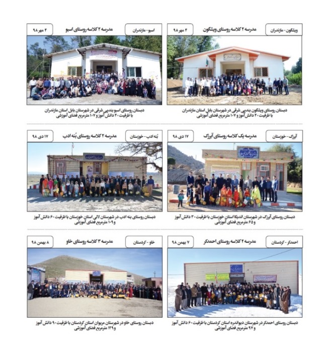 در میان 44 مدرسه با 102 کلاس، 29 مدرسه روستایی در استان های کهگیلویه و بویراحمد، سیستان و بلوچستان، خراسان رضوی، کردستان، گلستان، خوزستان و مازندران و 15 مدرسه در شهرهای چرداول، مهران، گمیشان، آق قلا، پلدختر، گتوند و شوشتر از استان های ایلام، گلستان، لرستان و خوزستان بهره برداری شد.