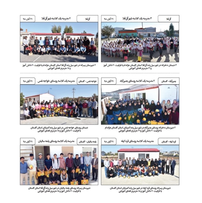 از تعداد مذکور، 15 مدرسه به دانش آموزان مناطق سیل زده گمیشان، آق قلا و گرگان در استان گلستان، پلدختر در استان لرستان و گتوند و شوشتر در استان خوزستان که در سال گذشته با بحران سیل و تخریب مدارسشان مواجه بودند، اهدا شد.