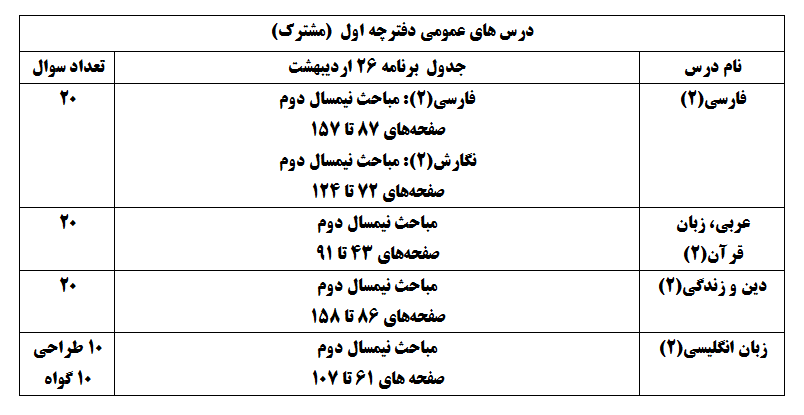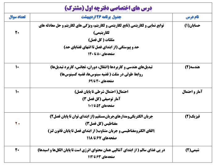 مباحث دروس عمومی شامل کلیه مطالب نیمسال دوم بوده و مباحث دروس اختصاصي در دفترچه مشترک از ابتداي نيم سال دوم تا پايان 80درصد نیمسال دوم است و در دفترچه غيرمشترك شامل 20درصد پایانی نیمسال دوم میباشد.