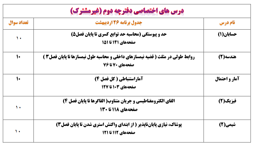 برنامه دروس اختصاصی در دفترچه های مشترک و غیر مشترک به شرح زیر میباشد: