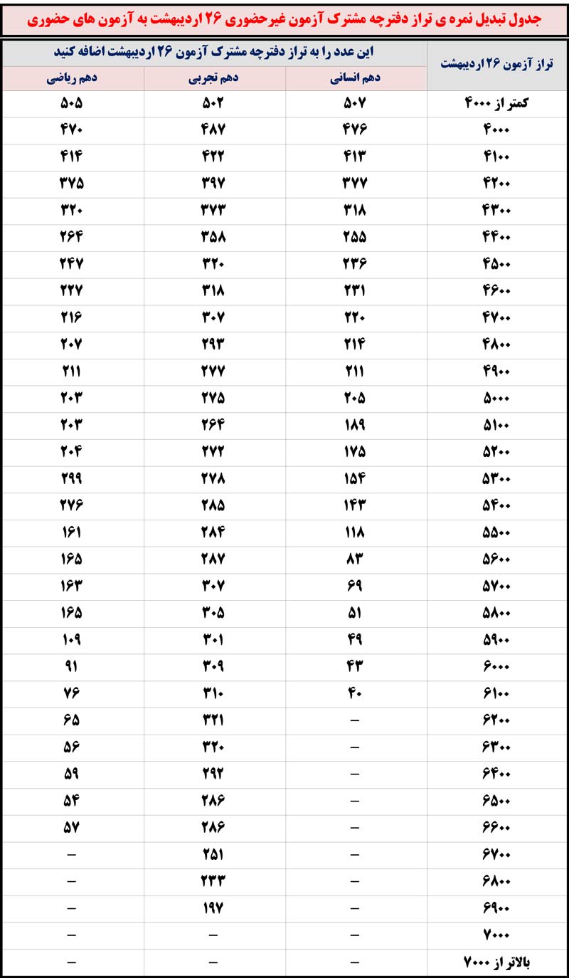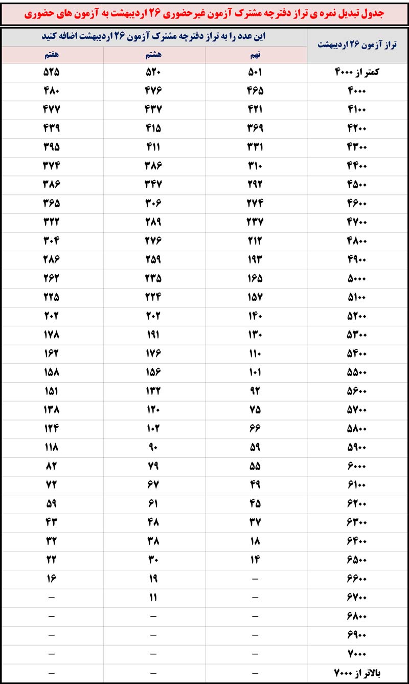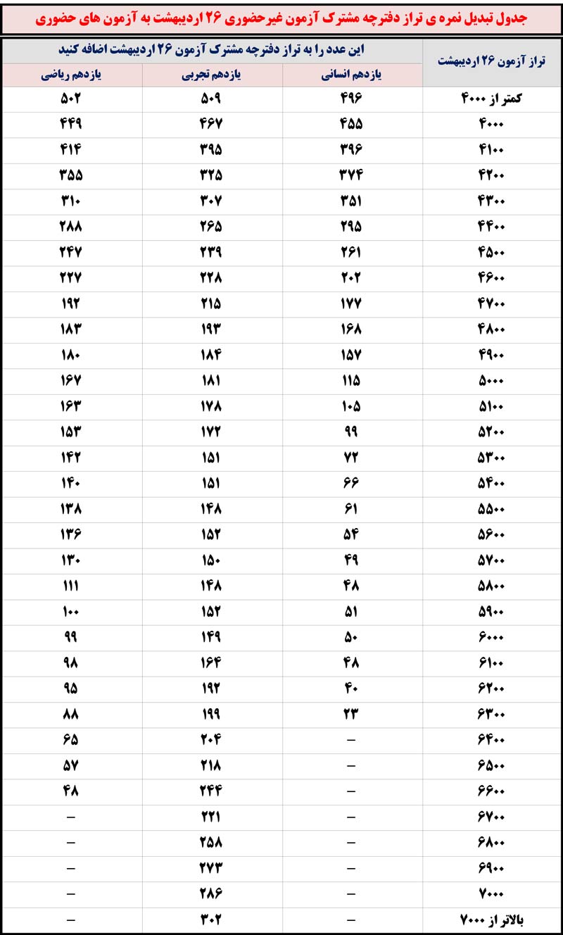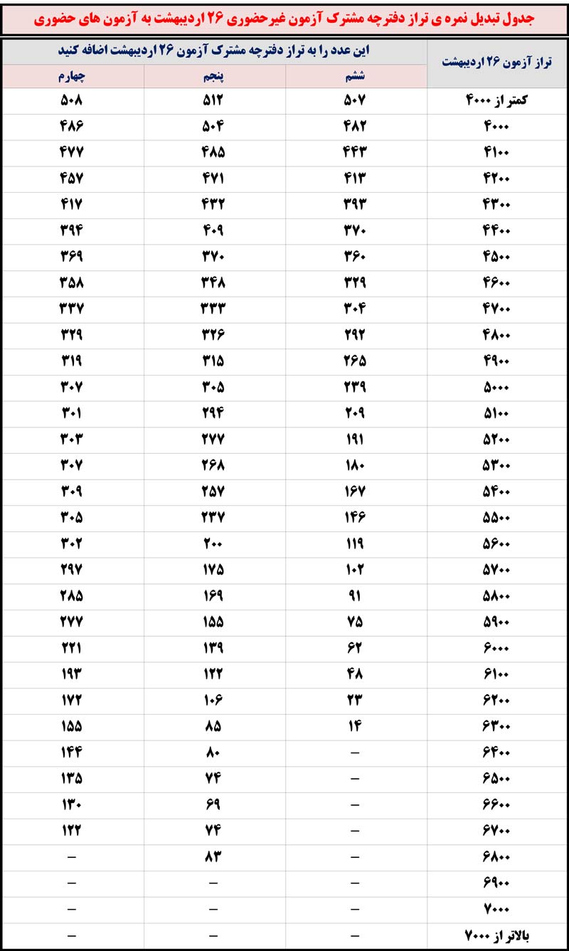 جدول تبدیل تراز دفترچه مشترک آزمون 26 اردیبهشت به آزمون حضوری