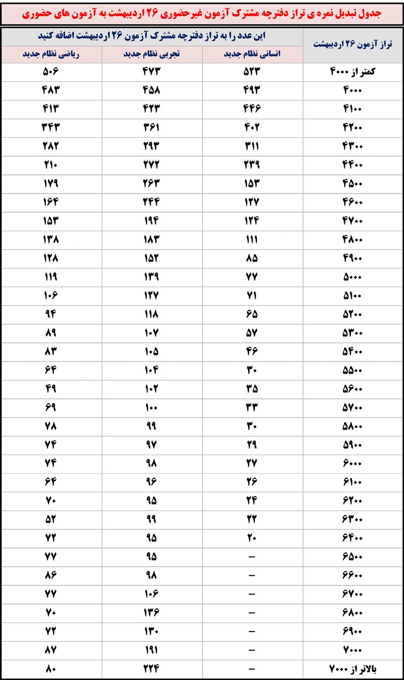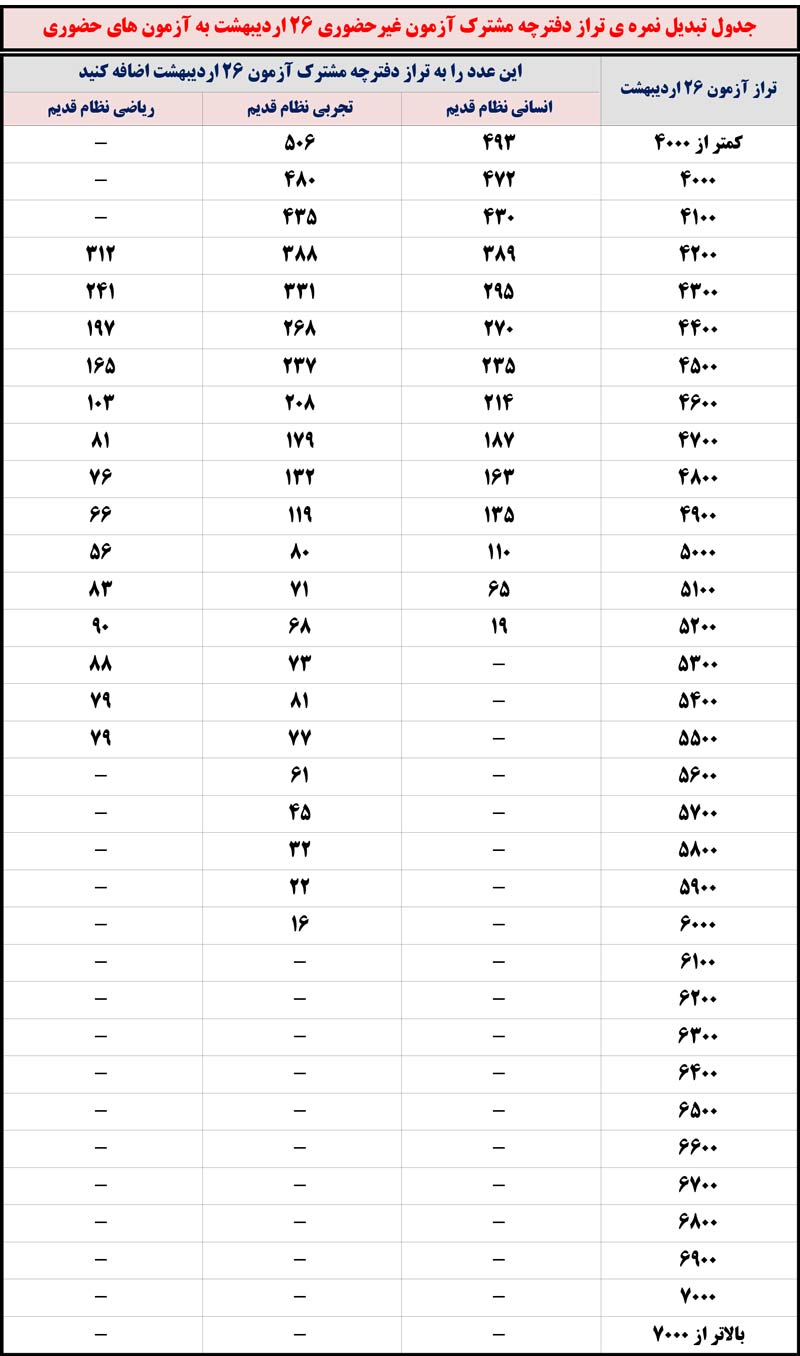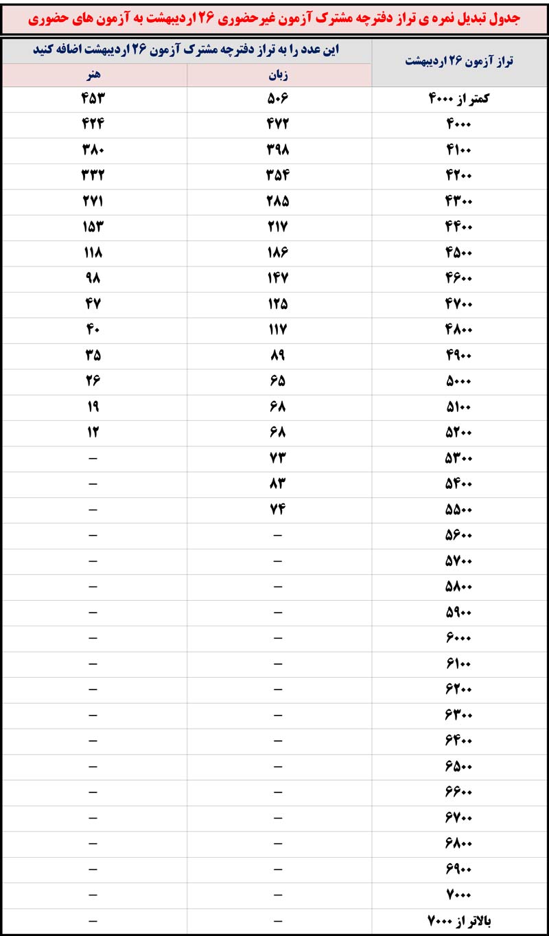 جدول تبدیل تراز دفترچه مشترک آزمون 26 اردیبهشت به آزمون حضوری
