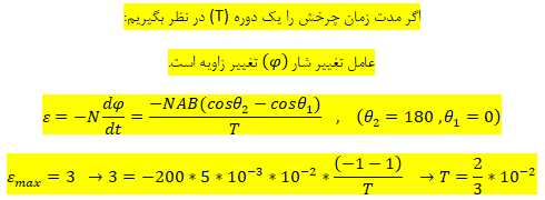 کامنت کاربر: پیچه ای دارای 200حلقه است و در میدان مغناطیسی 0.01 تسلا با سرعت زاویه ای ثابتی حول یکی از قطرهایش که عمود بر میدان مغناطیسی است میچرخد مساحت هر حلقه 50 سانتی متر مربع و بیشینه نیروی محرکه القایی در پیچه 3ولت است دوره چرخش چند ثانیه است؟_تاریخ ثبت: 13990221