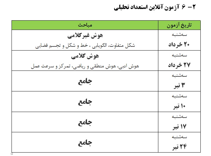 سهشنبه، 27 خرداد | هوش کلامی: هوش ادبی، هوش منطقی و ریاضی، تمرکز و سرعت عمل | 40 |