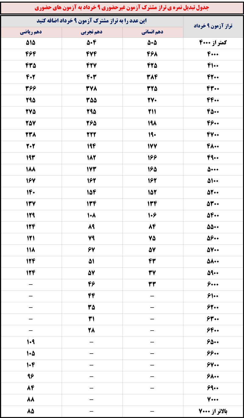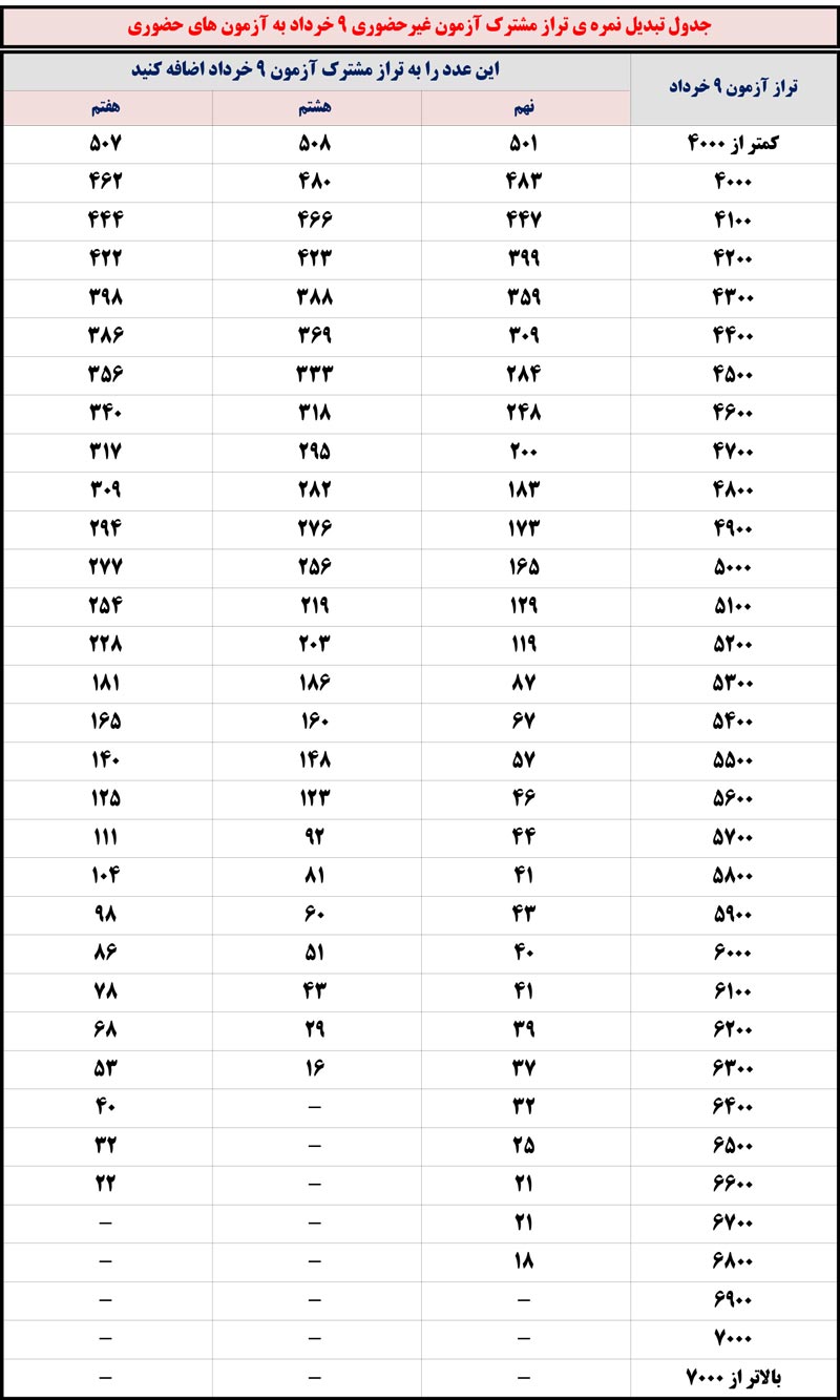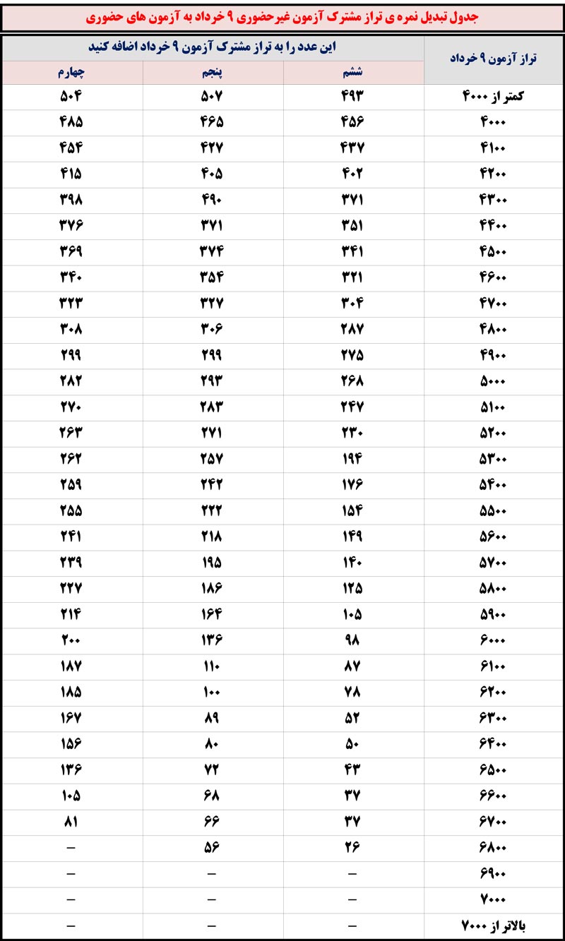 جدول تبدیل تراز دفترچه مشترک آزمون 9 خرداد به آزمون حضوری