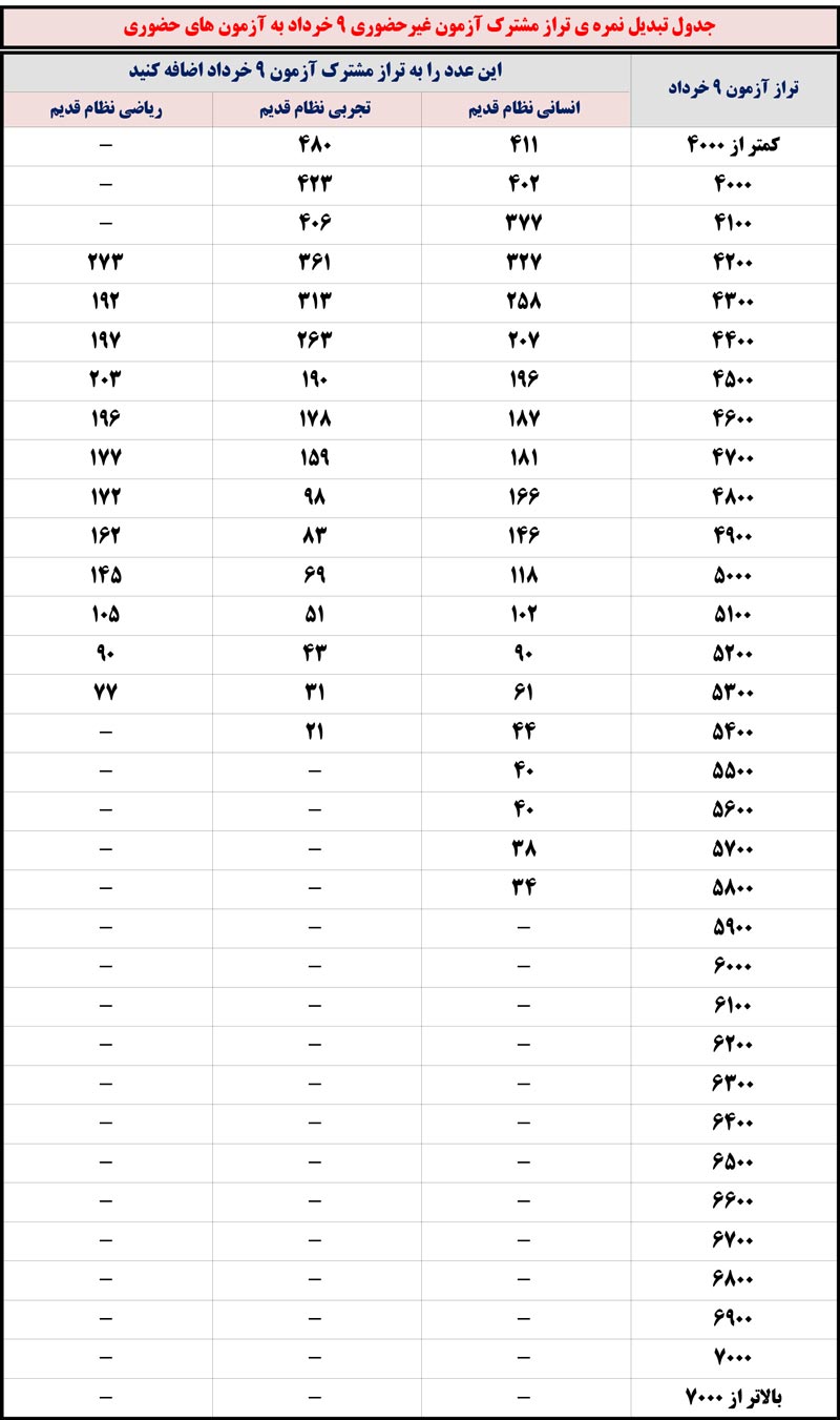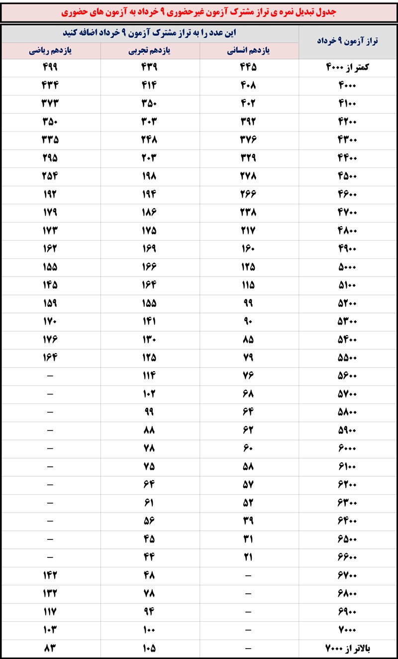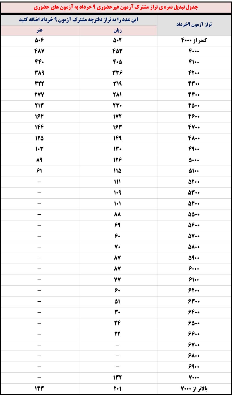جدول تبدیل تراز دفترچه مشترک آزمون 9 خرداد به آزمون حضوری