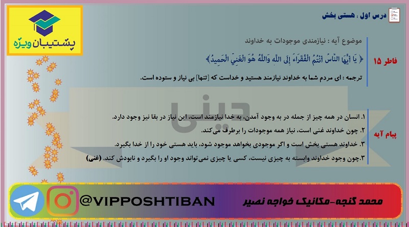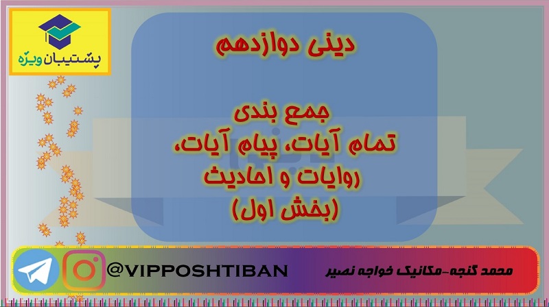 جمع بندی تمام آیات و روایات و احادیث دینی دوازدهم ، درس 1 تا 5 ؛ ویژه برای رسیدن به تسلط بر آیات و احادیث . امیدوارم مفید باشه براتون.