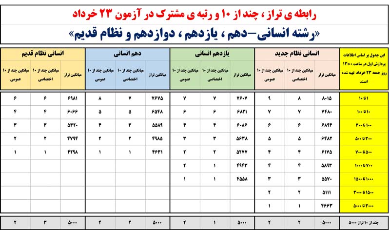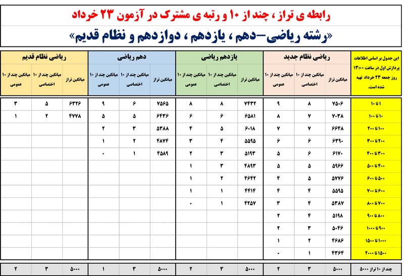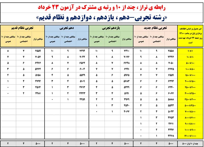 در جدول زیر جایگاه خود را پیدا کنید . چند از 10 خود را با هم ترازهایتان مقایسه کنید و سپس برای آزمون بعد هدف گذاری کنید .اگر خوب دقت کنید وقتی چند از 10خود را در فقط یک واحد افزایش دهید رتبه و ترازتان به طرز چشم گیری تغییر می کند و جا به جا می شود . شما برای هدف گذاری و برنامه ریزی به اطلاعات و آمار نیاز دارید . ما به طور منظم اطلاعات ضروری را در اختیار شما قرار می دهیم .