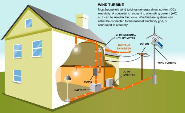 با استفاده از یك توربین كه توسط انرژى باد به حركت در میآید، انرژى الكتریكى در ژنراتور حاصل میگردد و میتوان از آن استفاده كرد. بدین شكل كه الكتریسیته تولید شده در توربین بادى كه از نوع جریان DC میباشد وارد محل مورد نظر شده، از آن جهت كه نوع جریان مصرفى از نوع متناوب AC میباشد، توسط یك اینورتر، عمل تغییر جریان از DC به AC انجام میشود و سبب شارژ باترى تغذیه كننده انرژى الكتریكى محل میشود.