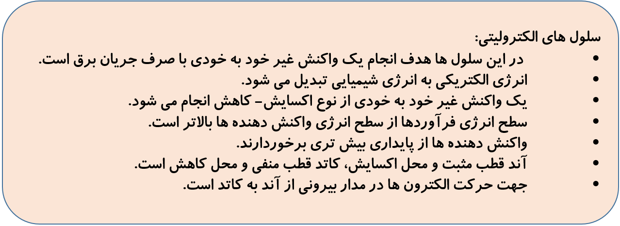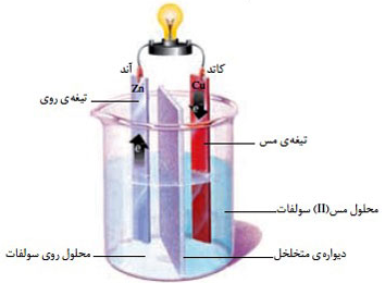 پاسخ کامنت امیررضا ایمانی ایمنی، ریاضى نظام جدید - بابل - میانگین تراز 7573: دستگاهی که بر اساس واکنش اکسایش-کاهش انرژی الکتریکی تولید میکند که شامل دو نیم سلول است. هر نیم سلول شامل یک الکترود است. واکنش اکسایش در نیم سلول آند(نیم سلولی که الکترود آن کاهندهتر است و پتانسیل کاهشی آن کوچکتر است) و واکنش کاهش در نیم سلول کاتد(نیم سلولی که الکترود آن اکسندهتر است و پتانسیل کاهشی آن بزرگتر است) انجام میپذیرد و یک دیواره متخلخلی هم بین دوتا نیم سلول وجود دارد._تاریخ ثبت: 13990314