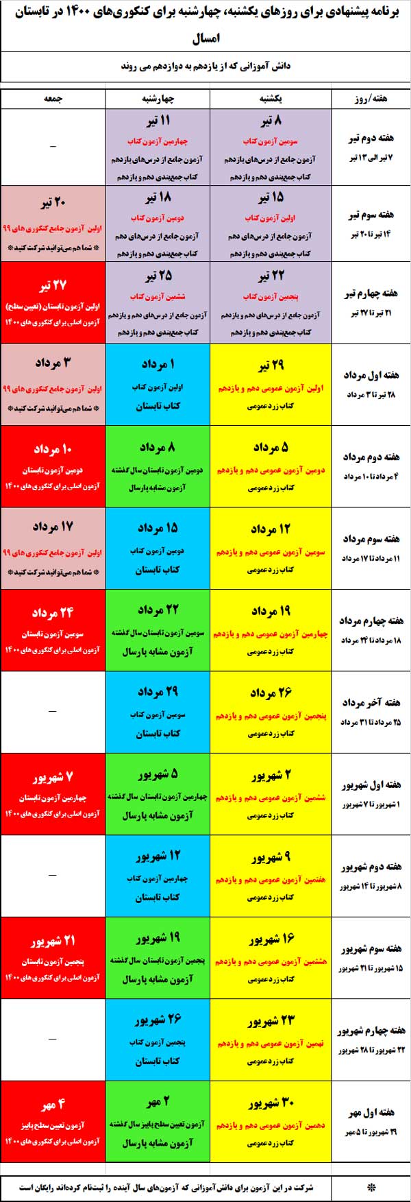 همچنین در طی تابستان علاوه بر آزمون های اصلی کانون در روزهای جمعه می توانید در روزهای یکشنبه و چهارشنبه از کتاب تابستان و کتاب زرد عمومی و همچنین آزمون غیرحضوری آزمون بدهید.