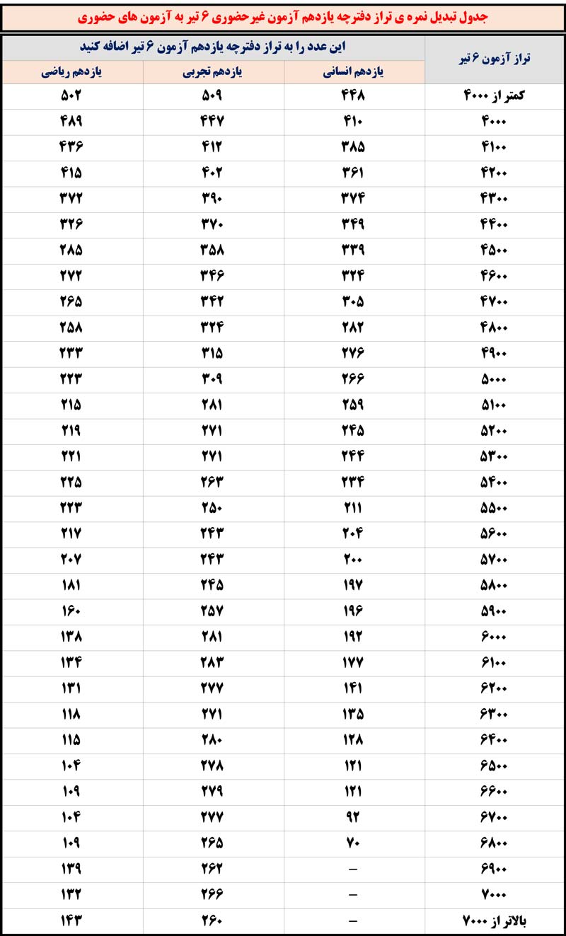 نکته : برای گروه دوازدهم ، تراز مجموع سه دفترچه ، برای گروه یازدهم ، تراز دفترچه یازدهم ، برای گروه دهم تراز دفترچه دهم و برای گروه های نظام قدیم و هنر و زبان ، تراز کل ، جهت تبدیل تراز استفاده شده است.