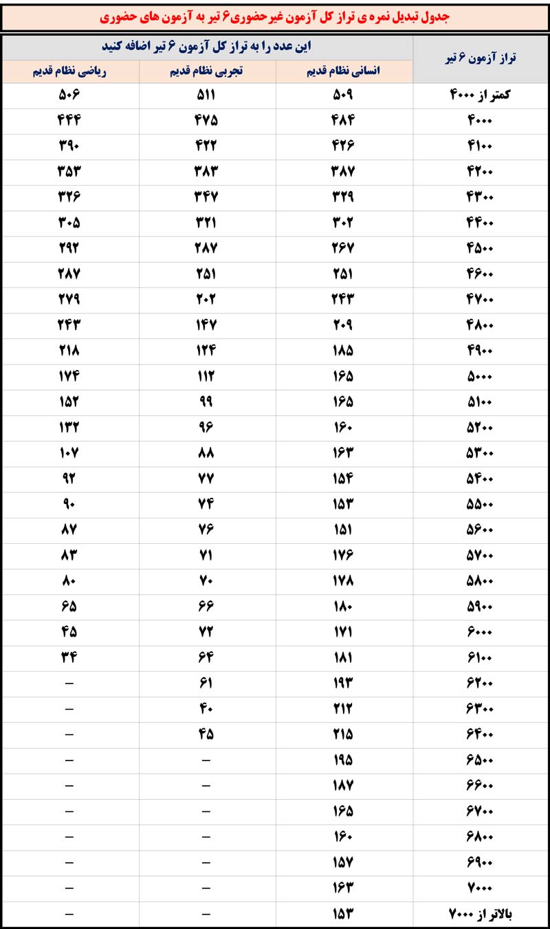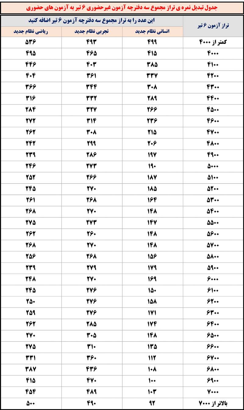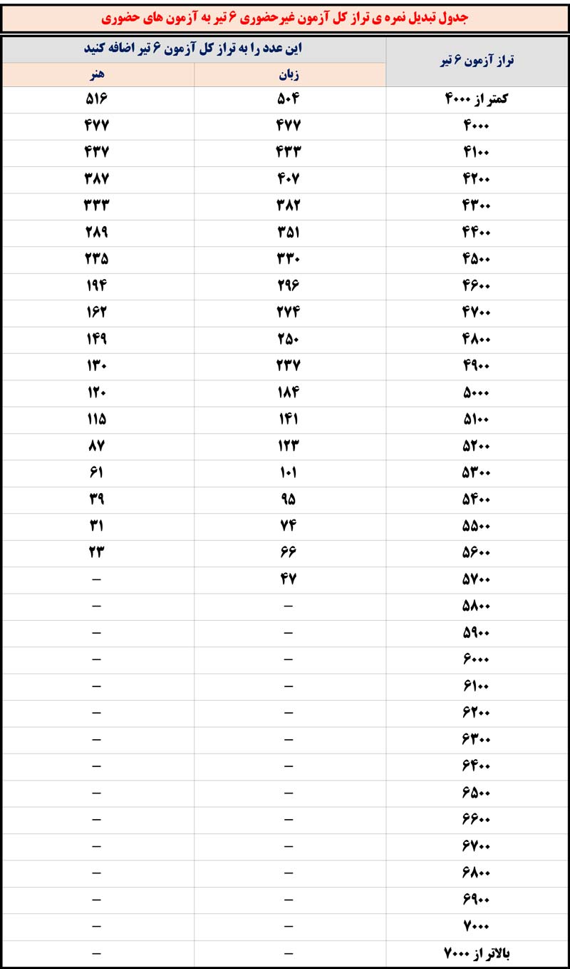 جدول تبدیل تراز آزمون غیرحضوری آزمون 6 تیر به آزمون حضوری را در ادامه مشاهده کنید.