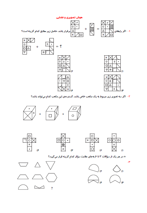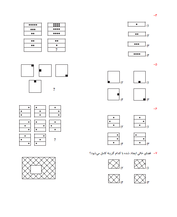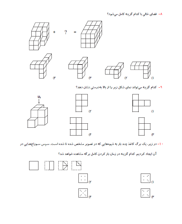 در زیر نمونه سوالهای هوش و استعداد بخش هوش تصویری و فضایی برای شما آورده شده است. سوالها را به دقت بخوانید و آن ها را پاسخ دهید. سپس پاسخ خود را با پاسخ تشریحی که در ادامه فایل پی دی اف آن را برای شما میآوریم مقایسه کنید.
