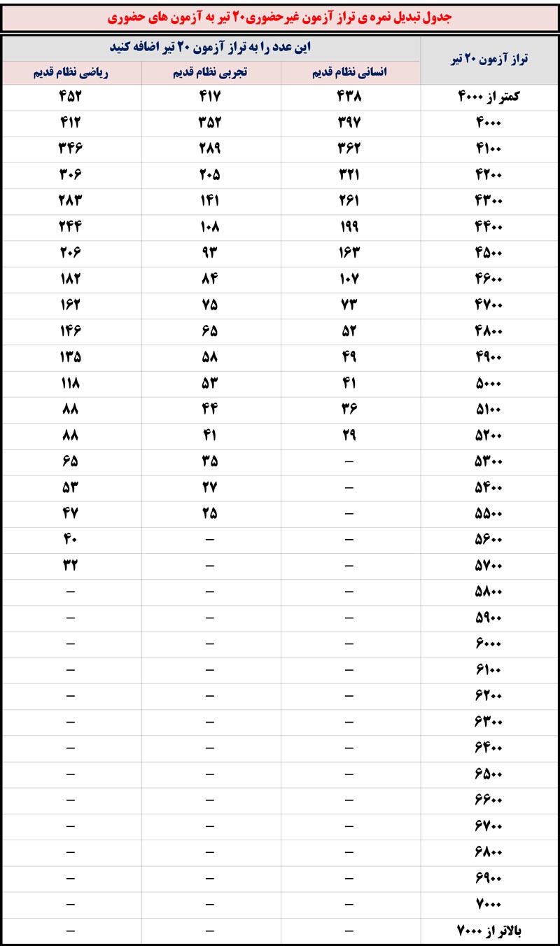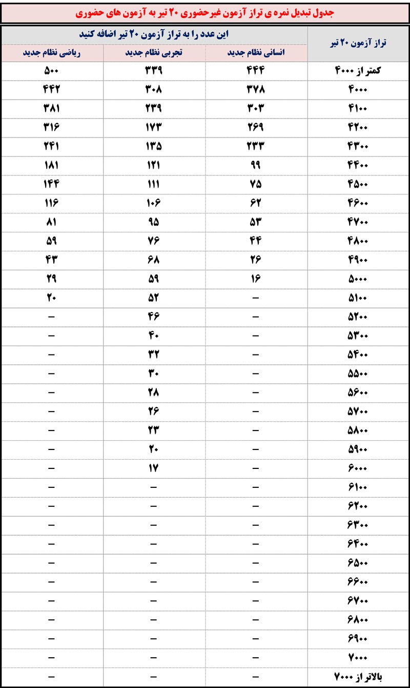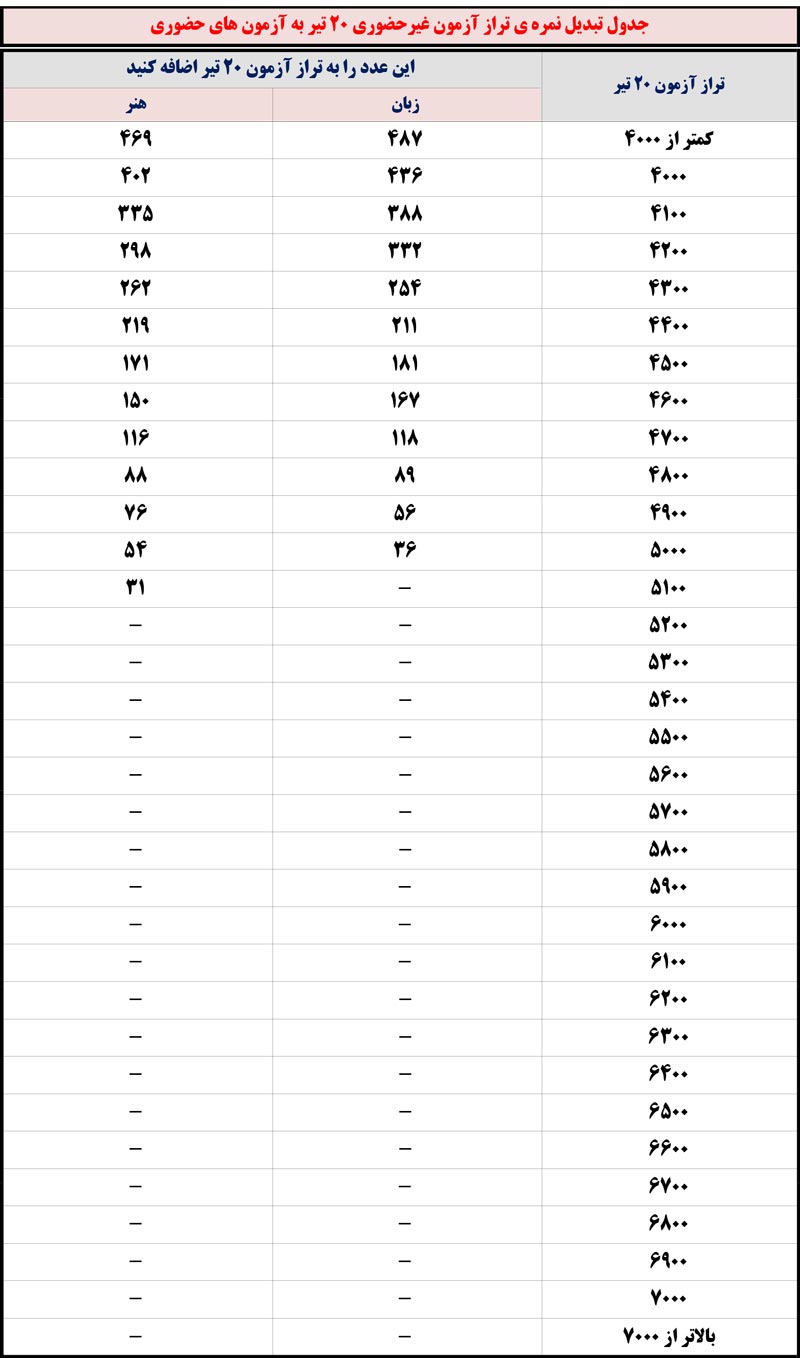جدول تبدیل تراز آزمون غیرحضوری آزمون 20 تیر به آزمون حضوری را در ادامه مشاهده کنید.در این جدول ها تراز کل در نظر گرفته شده است.